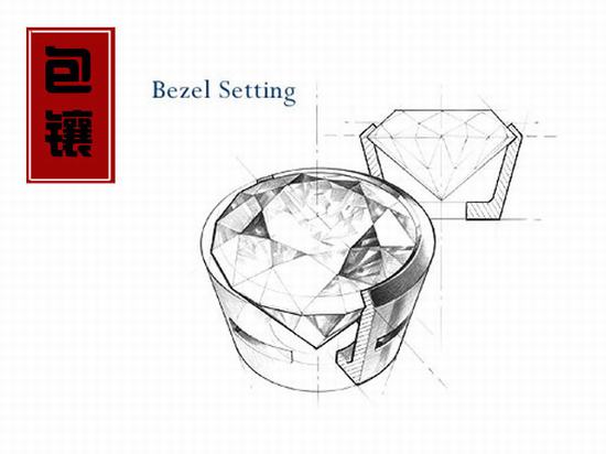 镶嵌方式:用金属薄片作边将钻石腰部以下部分包裹起来,并封在金属托架之内。